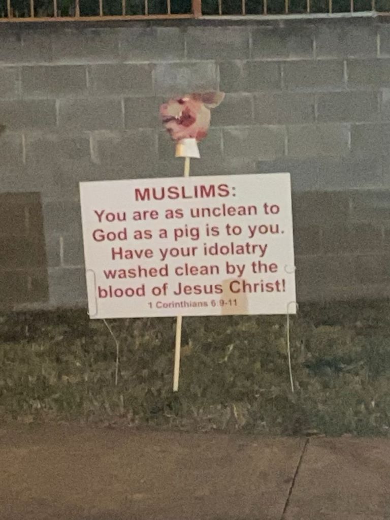 Officials at the Islamic Center of Greater Austin and Austin Peace Academy took a photo of a bloodied pig’s head mask that was staked into the front lawn of the mosque along with a sign that read: “Muslims: you are as unclean to God as a pig is to you. Have your idolatry washed clean by the blood of Jesus Christ.” Worshippers discovered the hate vandalism around 1 a.m. this morning.