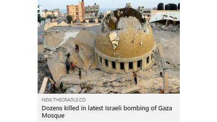 As part of its ongoing genocidal campaign of ethnic cleansing in Gaza and the West Bank, Israel killed at least 50 Palestinians when a mosque in the Sabra neighborhood of Gaza was bombed during prayers.