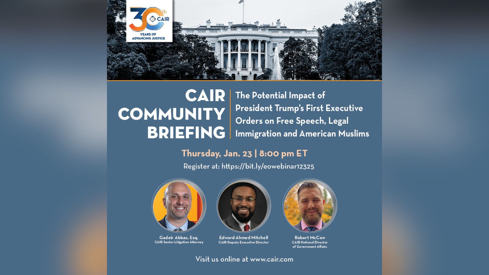 On Thursday, Jan. 23rd, at 8:00 pm eastern, the Council on American-Islamic Relations (CAIR), the nation’s largest Muslim civil rights and advocacy organization, plans to host a virtual community briefing about the potential impact of President Trump’s first wave of executive orders on American Muslims, free speech, and legal immigration.